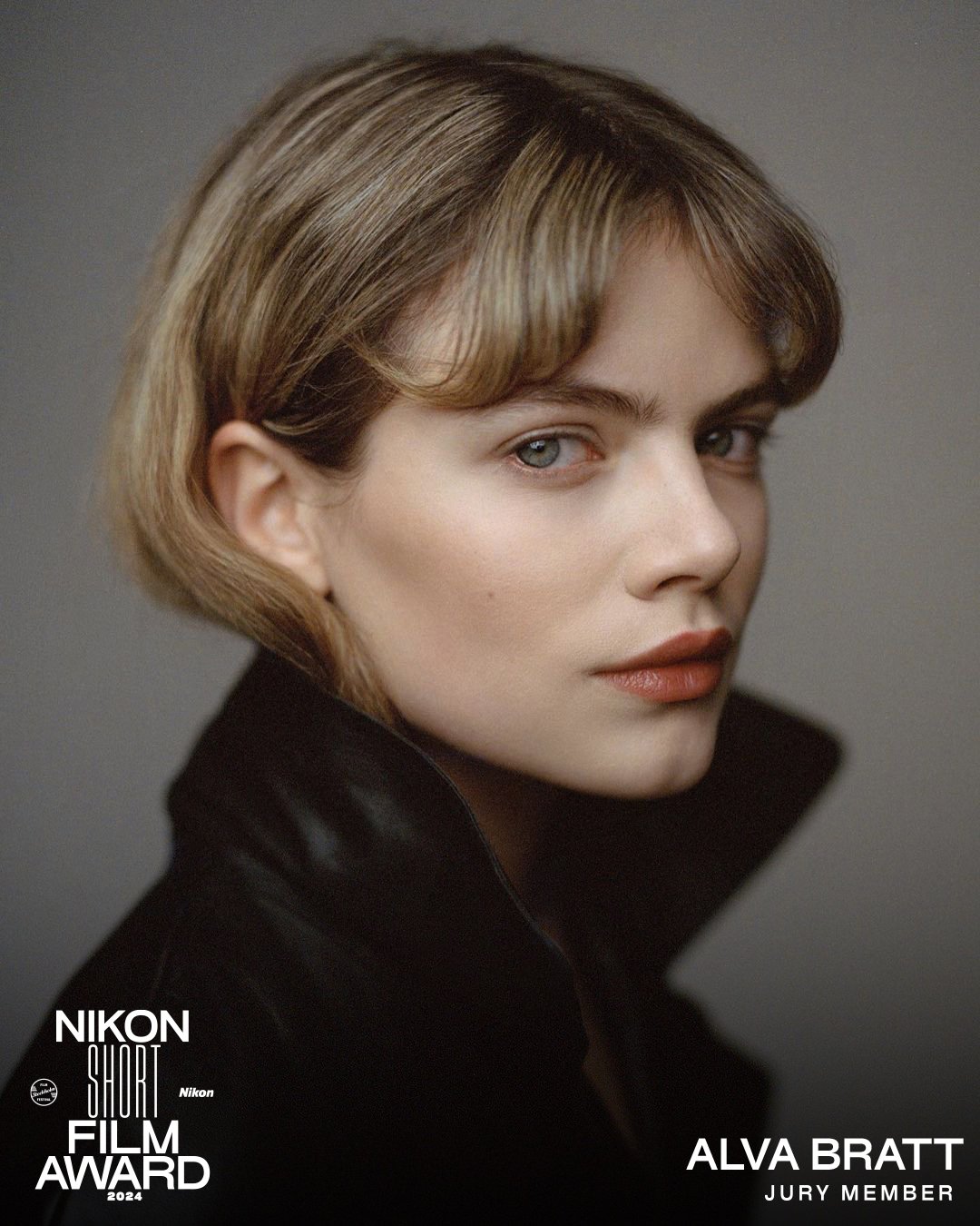 Portrait of a woman with blue eyes, wearing gold earrings and a black off-the-shoulder top, looking over her shoulder with a neutral expression.
