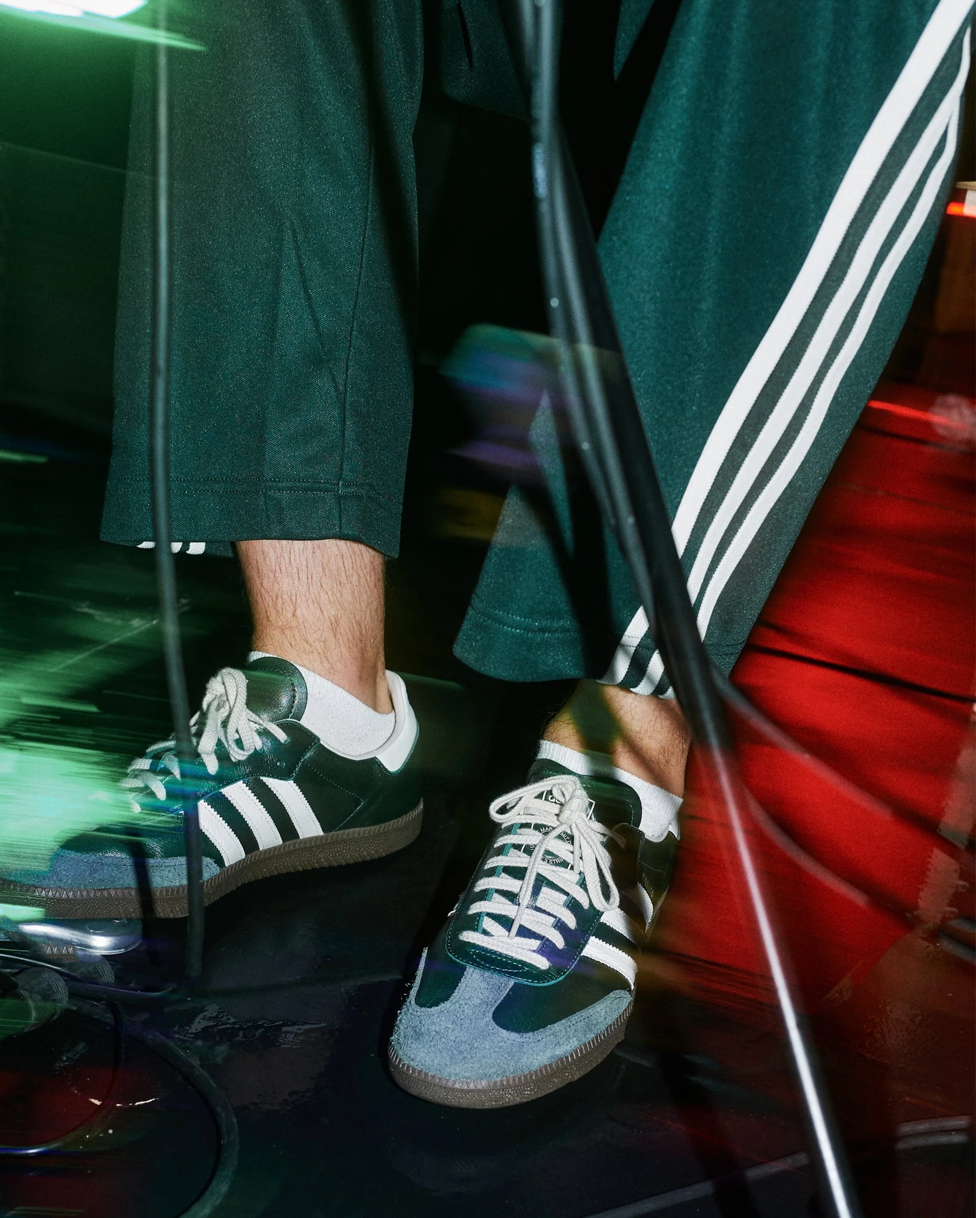 Person wearing a brown blazer and red tights, posing seated on a white cube with a neutral background.